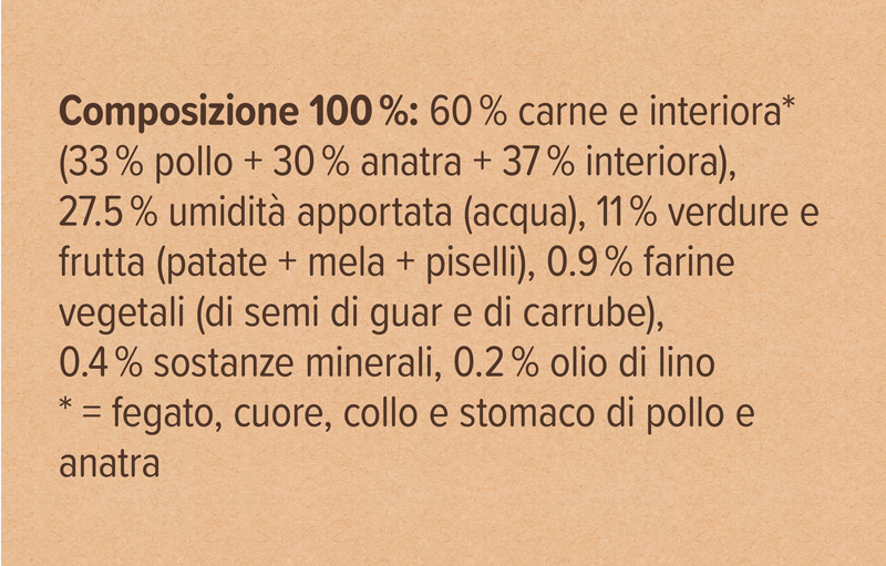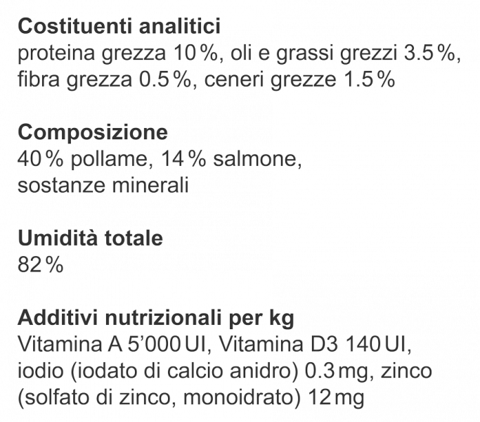 In linea generale vale: un cibo di alta qualità per cani e gatti si riconosce da una lista ingredienti trasparente e da additivi ben motivati. Più la lista ingredienti è chiara e comprensibile, meglio si può valutare la qualità del cibo.
